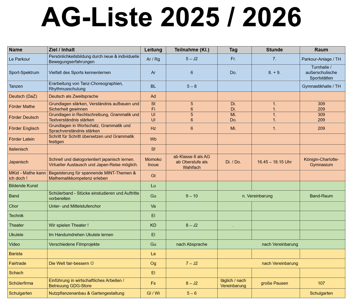 Neben SportSpektrum, SportsOpen (Jonglieren, Le Parkour, Akrobatik) gibt es eine Basketball- und eine Hip-Hop AG.